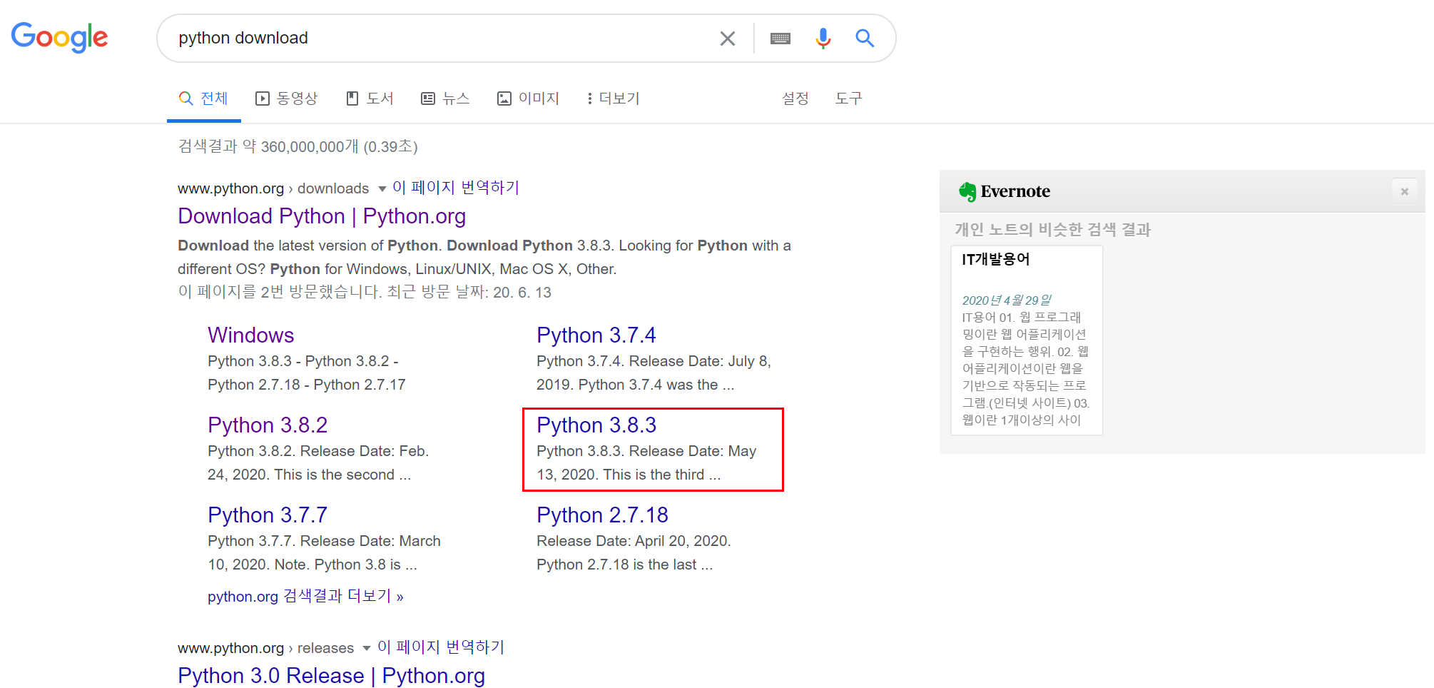 구글에 python download 검색한 후 화면과 같이 최신버전을 클릭합니다.