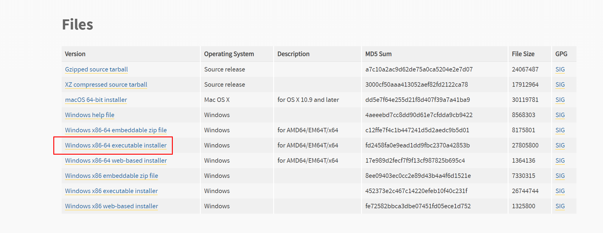 맨 하단에 Files에 각자 OS에 맞는 버전을 클릭하여 다운받습니다.