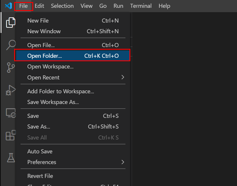 1. File > Open Folder.. 클릭해서 프로젝트 생성할 폴더를 지정해서 열어줍니다.