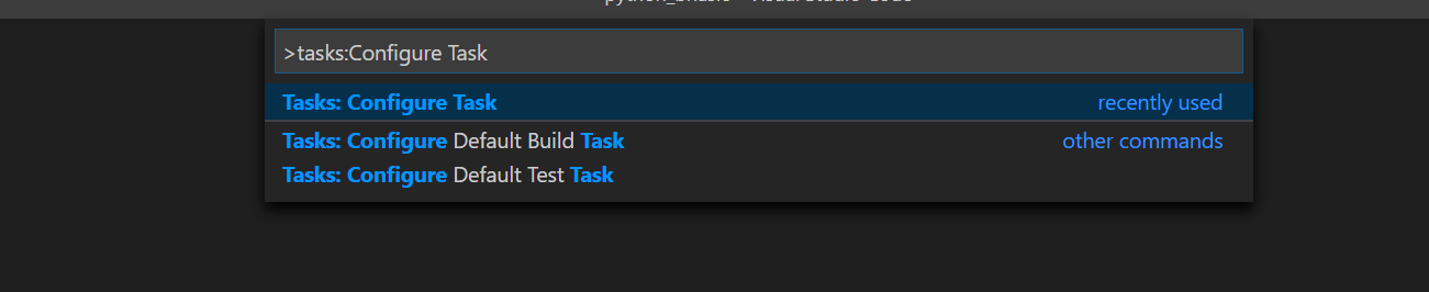 { // See https://go.microsoft.com/fwlink/?LinkId=733558 // for the documentation about the tasks.json format "version": "2.0.0", "tasks": [ { "label": "Project Label", "type": "shell", "command": "python", "args": [ "${file}" ], "presentation": { "reveal": "always", "panel": "new" }, "options": { "env": { "PYTHONIOENCODING": "UTF-8" } }, "group": { "kind": "build", "isDefault": true } } ] }